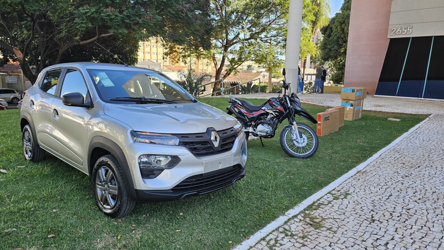 #PraTodosVerem: Na capa da matéria há uma foto que mostra um automóvel Renault Kwid 0km, uma motocicleta 150cc 0km, e quatro caixas de papelão, contendo dois televisores smart e um aparelho de ar-condicionado (condensadora e evaporadora em caixas separadas), posicionados em frente à Central de Atendimento ao Cidadão (CAC) William Maksoud Filho.