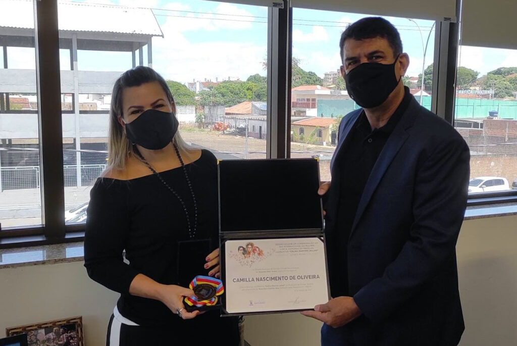 O vereador Beto Avelar (PSD) entregou nesta sexta-feira (12/03) a medalha “Celina Martins Jallad”, em alusão ao Dia Internacional da Mulher, para Camilla Nascimento de Oliveira, diretora-presidente do Instituto Municipal de Previdência de Campo Grande – IMPCG. A medalha é uma honraria concedida pelo Legislativo em reconhecimento ao trabalho de destaque da Mulher na sociedade.