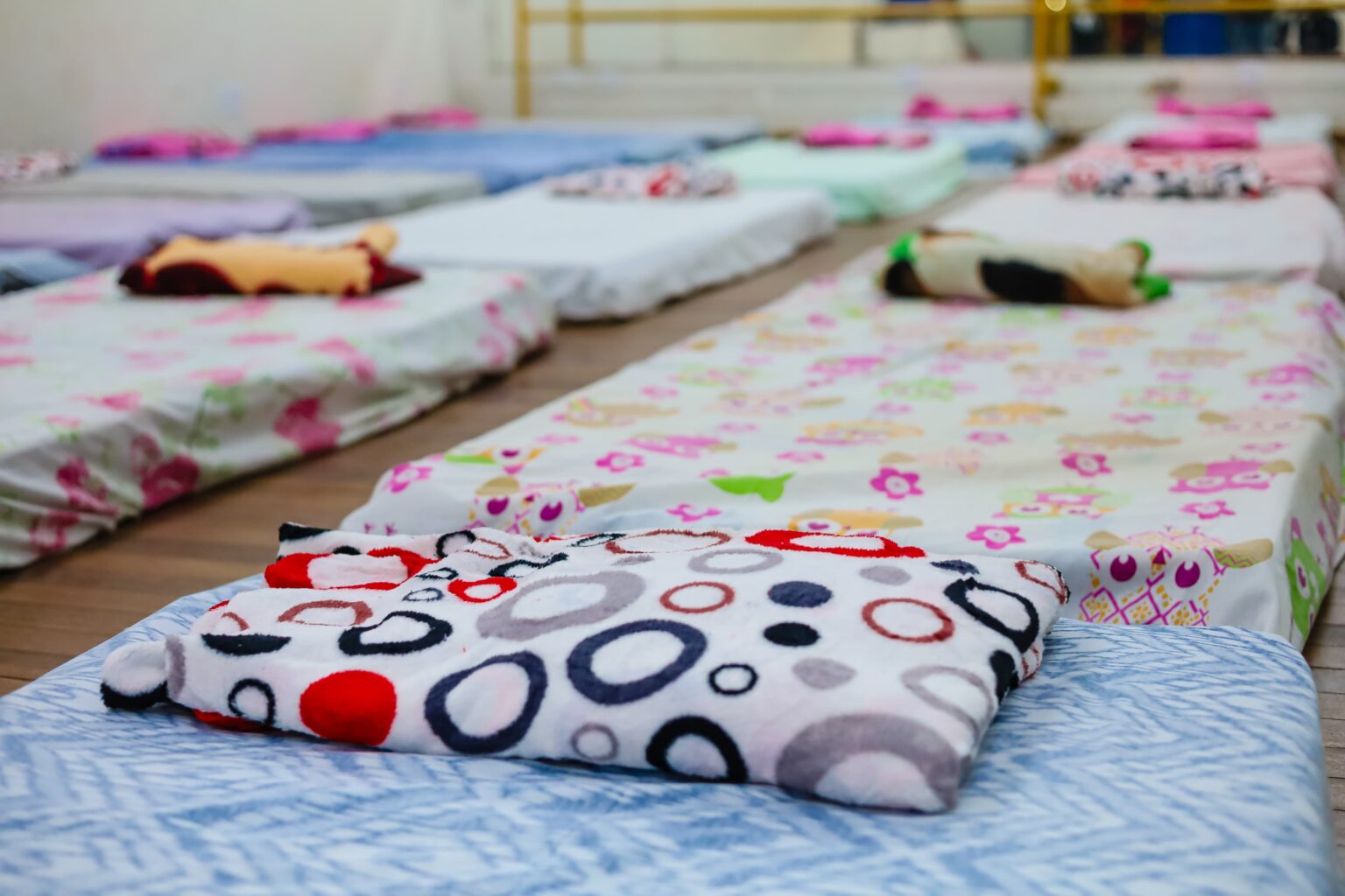 O espaço utilizado conta com salas internas fechadas, colchões, alimentação fornecida por entidades parceiras, entrega de agasalhos e estrutura para receber também os pets que acompanham essa população.