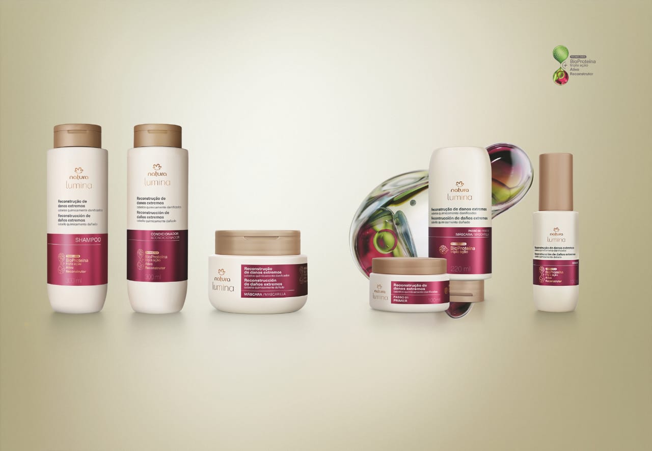 A linha para Cabelos Quimicamente Danificados de Natura Lumina possui BioProteína Tripla Ação e Ativo Reconstrutor. Essa dupla promove reconstrução de até 89% dos danos extremos e prevenção de até 2,9 vezes dos danos futuros. O Kit Tratamento Intensivo contém dois produtos: o Primer (passo 1) e a Máscara (passo 2) , que recuperam os fios e prolongam o efeito da progressiva e coloração desde a primeira aplicação.