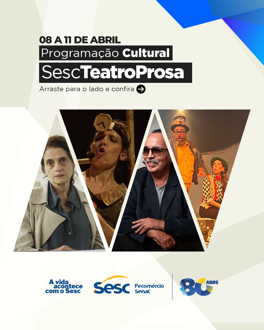 O Sesc Teatro Prosa prepara uma programação diversificada entre os dias 8 e 11 de abril, reunindo cinema, espetáculo teatral, show musical e atração infantil em Campo Grande. A agenda aposta em diferentes linguagens artísticas e públicos, com atividades que transitam entre temas sensíveis, experiências musicais e opções voltadas às famílias.