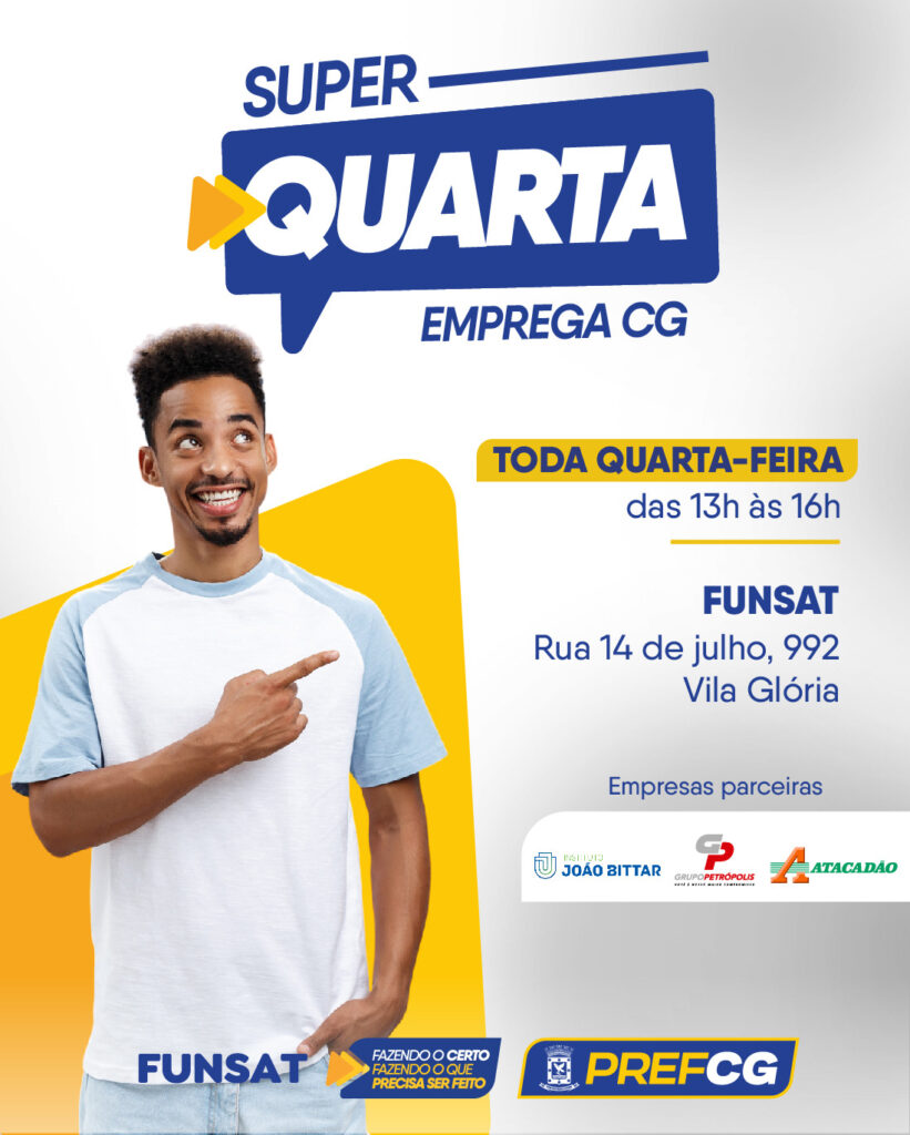 O órgão intermedia também 200 vagas do expediente em mais uma edição do Emprega CG, na “Super Quarta”. Seleção que projeta um encaminhamento de colocação a cada cinco minutos, na abordagem feita das 13h às 16h.