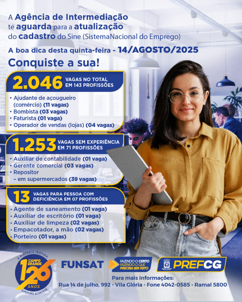 Mais informações pelo telefone (67) 4042-0585, ramal 5800, ou pelo Instagram oficial da pasta: @funsat.cg. A relação completa das vagas está disponível no site da Prefeitura de Campo Grande: https://www.campogrande.ms.gov.br/funsat/sec-artigos/vagas-ofertadas/.