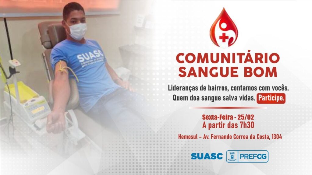 A Prefeitura Municipal de Campo Grande, por meio da Subsecretaria Municipal de Articulação Social e Assuntos Comunitários – SUASC, realizará campanha e doação de sangue “Comunitário Sangue Bom”, no dia 25 de fevereiro, das 7:30 às 12h. A campanha tem como objetivo sensibilizar os mais de 100 servidores, suas famílias e as lideranças comunitárias sobre a importância da doação de sangue.