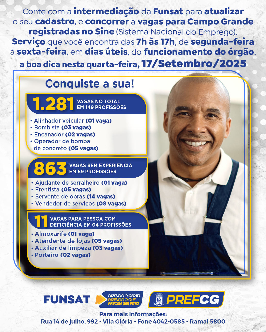 Nesta quarta-feira, 17 de setembro, a Fundação Social do Trabalho (Funsat) intermedia vagas para 188 empresas de Campo Grande, distribuídas em 149 atividades diferentes. Além das oportunidades de emprego, a pasta promove mais uma edição do evento “Super Quarta”, com recrutamentos imediatos durante a tarde para três grandes empresas.