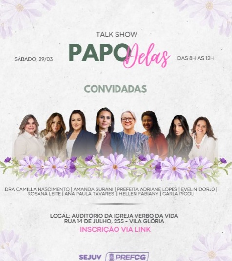 A Secretaria Executiva da Juventude realiza neste sábado, 29 de março, o Talk Show Papo Delas, um evento dedicado ao empoderamento feminino em homenagem ao Mês da Mulher. A programação está marcada para acontecer na Rua 14 de Julho, 255 – Vila Glória, e promete uma manhã repleta de troca de experiências, aprendizados e inspiração, com foco no desenvolvimento pessoal e profissional das participantes.