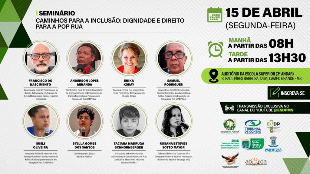 O Seminário Caminhos para a Inclusão: Dignidade e Direito para a População em Situação de Rua está com data marcada para os dias 15 e 16 de abril. O evento é uma realização da Defensoria Pública de Mato Grosso do Sul, por meio do Núcleo de Direitos Humanos (Nudedh), e conta com o apoio do Tribunal de Contas do Estado de Mato Grosso do Sul.