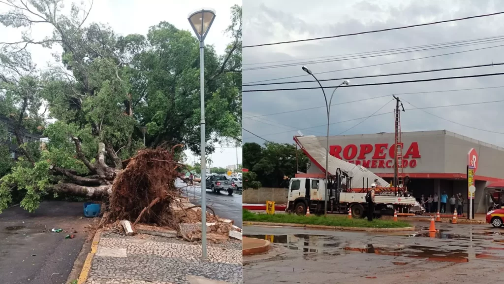 O temporal com forte ventania que atingiu Jardim, município distante 240 km de Campo Grande, deixou um rastro de destruição por toda a cidade na tarde desta quinta-feira (20). Na região central duas árvores centenárias e de grande porte foram arrancadas pela raiz.