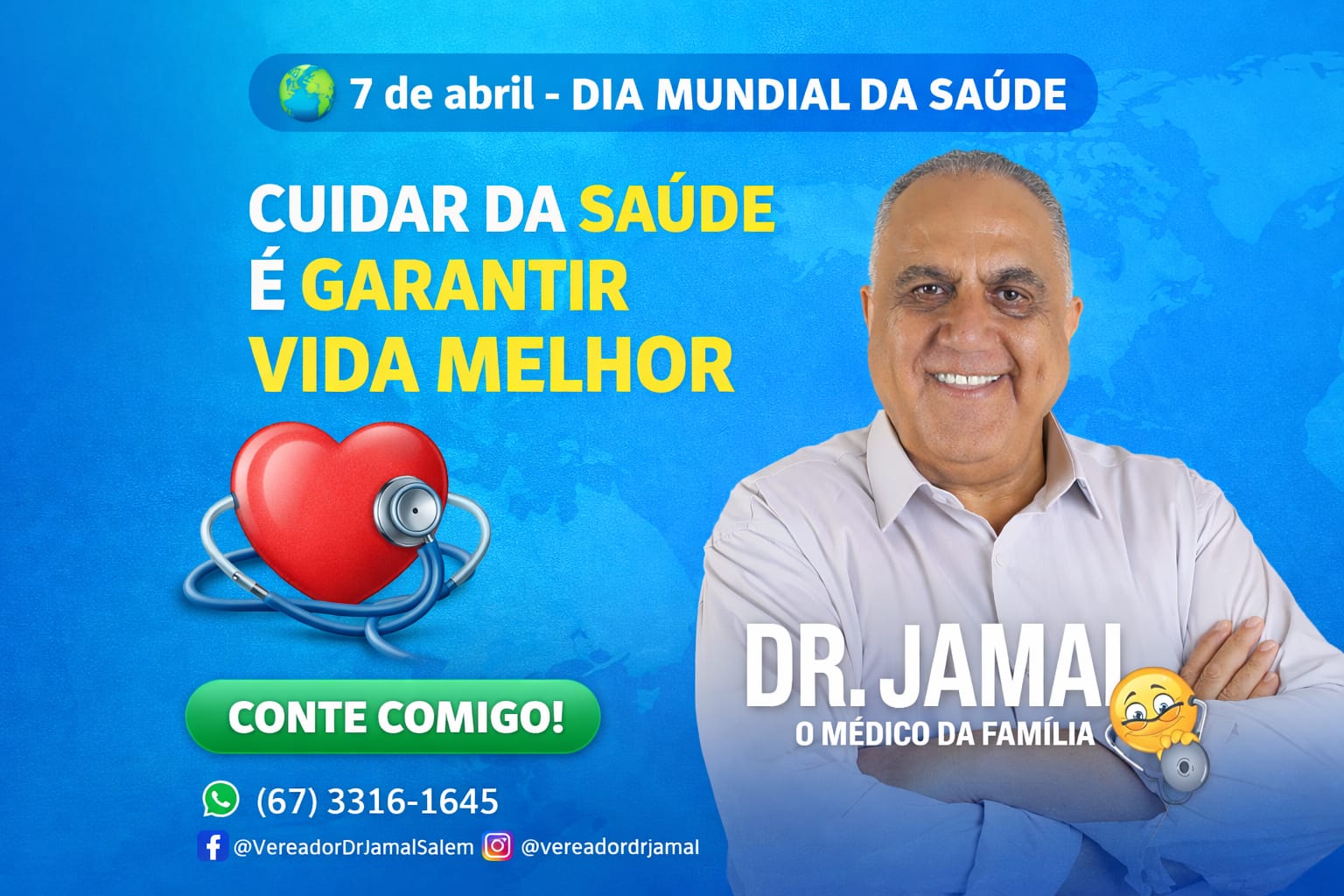 No Dia Mundial da Saúde, celebrado em 7 de abril, o vereador Jamal Salem destacou a importância de cuidar da saúde da população e reforçou seu compromisso com ações que promovam mais qualidade de vida para os moradores de Campo Grande.